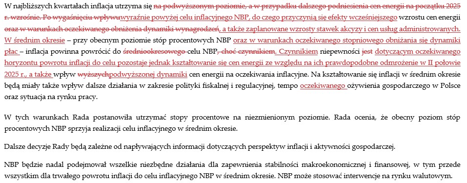 Przejdźmy do komunikatu, który zawierał kilka zmian, choć nie wszystkie uznajemy za istotne. Najważniejszą naszym zdaniem modyfikacją było dodanie fragmentu dotyczącego cen regulowanych i ich wpływu na ścieżkę inflacji. Mowa jest tutaj o stawkach akcyzy i cenach administrowanych, a osobne zdanie poświęcono cenom energii. Dodano bowiem następujący fragment: Czynnikiem niepewności dotyczącym oczekiwanego horyzontu powrotu inflacji do celu pozostaje jednak kształtowanie się cen energii ze względu na ich prawdopodobne odmrożenie w II połowie 2025 r. [...]. Jest to wyraźne podkreślenie istoty tego elementu z punktu widzenia RPP. Czy słusznie? Naszym zdaniem nie do końca, o czym już zresztą wielokrotnie pisaliśmy. Tarcza zawsze kiedyś wygasa i jest ryzyko, że ceny wzrosną, ale stosowanie tych samych argumentów przy braku tarczy i po wprowadzeniu tarczy to fikołek intelektualny, którego nie potrafimy zrozumieć.