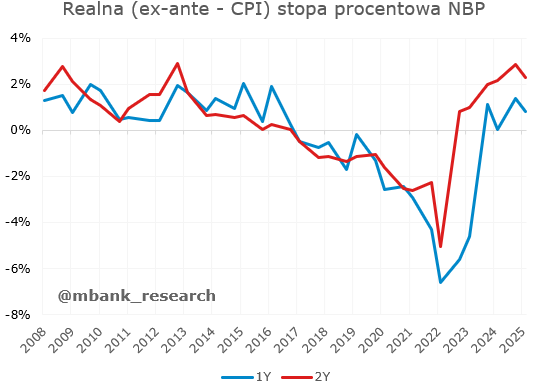 Przede wszystkim rzuca się w oczy okres, w którym to stopy realne obniżyły się poniżej zera. Oznacza to, że polityka monetarna stała się wyraźnie ekspansywna mniej więcej w 2017 roku i taki stan rzeczy trwał w najlepsze do momentu rozpoczęcia agresywnych podwyżek kosztu pieniądza przez bank centralny. Następnie, przy stopniowym stabilizowaniu inflacji, nastąpił wzrost stóp realnych, które aktualnie znajdują się na względnie wysokich pułapach. Czego oczekujemy dalej? Zakładamy, że NBP jeszcze obniży stopy, a inflacja w przyszłym roku może okresowo podskoczyć (nasza aktualna prognoza). Wówczas stopy realne obniżą się. Z punktu widzenia inwestora finansowego taka zmiana może okazać się czynnikiem nieco zniechęcającym do lokowania środków w krajowej walucie.