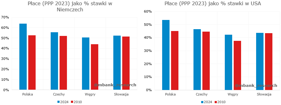Z danych Eurostat wynika, że na przestrzeni ostatnich kilkunastu lat Polska najmocniej zredukowała lukę płacową względem gospodarki niemieckiej (europejski benchmark). W Czechach i na Węgrzech progres okazał się zauważalnie mniejszy. Sądzimy, że stopniowe znikanie konkurencyjności kosztowej polskiej gospodarki może oddziaływać w stronę deprecjacji krajowej waluty w długim okresie. Sygnalizować może to także niższą naturalną stopę procentową oraz niższy potencjalny wzrost PKB w kolejnych latach.