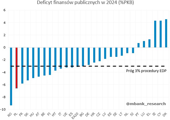 W tym świetle obniżka perspektywy przez agencje ratingowe sygnalizuje to ryzyko. Co więcej, przed wyborami parlamentarnymi zaplanowanymi na 2027 rok możliwa jest większa ekspansja fiskalna. Takie wnioski można wysnuwać po słowach prezydenta Nawrockiego, który nie tylko zapowiada sprzeciw podwyżkom podatków dla gospodarstw domowych, ale też proponuje własne rozwiązania wręcz obniżające dla nich obciążenia podatkowe, zdając sobie doskonale sprawę, że wśród obietnic koalicji rządzącej była obniżka kwoty wolnej od podatku, na którą – patrząc na problem stricte od strony fiskalnej – raczej nie ma przestrzeni. Tymczasem presja ze strony KE, aby ograniczać deficyty, zacznie narastać, zwłaszcza jeśli inne kraje będą spełniać wymagane progi 3% dla deficytu (między innymi Dania, Irlandia, Cypr, Grecja, Portugalia, Szwecja – własną opinię można wyrobić sobie na podstawie załączonego rysunku). Pewnym ratunkiem może być tutaj tzw. klauzula wyjścia, umożliwiająca zwiększenie deficytu o 1,5% PKB rocznie (na wydatki zbrojeniowe) do końca 2028 roku. Podsumowując wątek fiskalny, jeśli Polska stałaby się samotnym liderem pod względem rozdętego deficytu budżetowego, taka sytuacja mogłaby prowadzić do wzrostu ryzyka fiskalnego. Taki wzrost korespondowałby z wyższymi rentownościami obligacji skarbowych (wyższa premia za ryzyko), które byłyby konieczne, aby przyciągnąć chętnych do inwestowania w krajowy rynek długu.