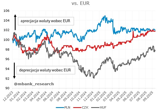 Od 2024 roku notowania głównych walut regionu CEE poddane były sporym perturbacjom. Skala zmian była jednak zróżnicowana między krajami. Najwięcej spokoju obserwowaliśmy w przypadku waluty Czech, gdzie bank centralny kontynuował cykl luzowania polityki pieniężnej. Z kolei forint jak i złoty żyły swoim życiem. Jesienią 2024 roku jasno widać było wpływ różnych kierunków polityki monetarnej w Polsce jak i na Węgrzech. Gdy na Węgrzech stopy procentowe zostały wówczas już mocno zredukowane, nad Wisłą nikt w banku centralnym nie myślał o wznowieniu cyklu obniżek stóp.
