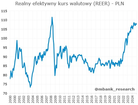 Pozostając jeszcze na chwilę w orbicie konkurencyjności, warto wspomnieć, że w ostatnim czasie doszło do znaczącej aprecjacji złotego liczonej w REER, czyli realnym, efektywnym kursie walutowym (wykres). Dlaczego to jest ważne i dlaczego warto na to patrzeć. Otóż REER mierzy całkowitą atrakcyjność polskich towarów dla odbiorców zagranicznych, kwantyfikując zarówno sam kurs nominalny, ceny towarów oraz zróżnicowanie geograficzne eksportu (wyższą wagę mają kursy względem walut, z którymi wymiana handlowa jest większa). W tym kursie jak na dłoni widoczne jest skokowe i szybkie osłabienie konkurencyjności. W tym kontekście nominalnej osłabienie krajowej waluty sprzyjałoby powrotowi do bardziej neutralnych poziomów. Drugą drogą jest deflacja/bardzo niska inflacja sprzedawanych towarów. Wtedy jednak dostosowanie ma uciążliwy charakter, który znacząco odczują zarówno firmy, jak i konsumenci. Uważamy, że bardziej prawdopodobne jest dostosowanie nominalne. W obecnych warunkach makro i przy znaczącej stymulacji fiskalnej na dewaluację wewnętrzną raczej brakuje miejsca (i powinniśmy się z tego cieszyć).