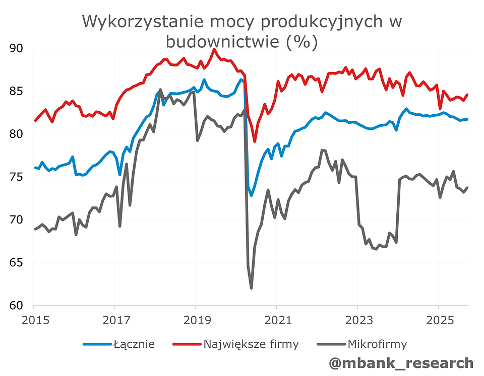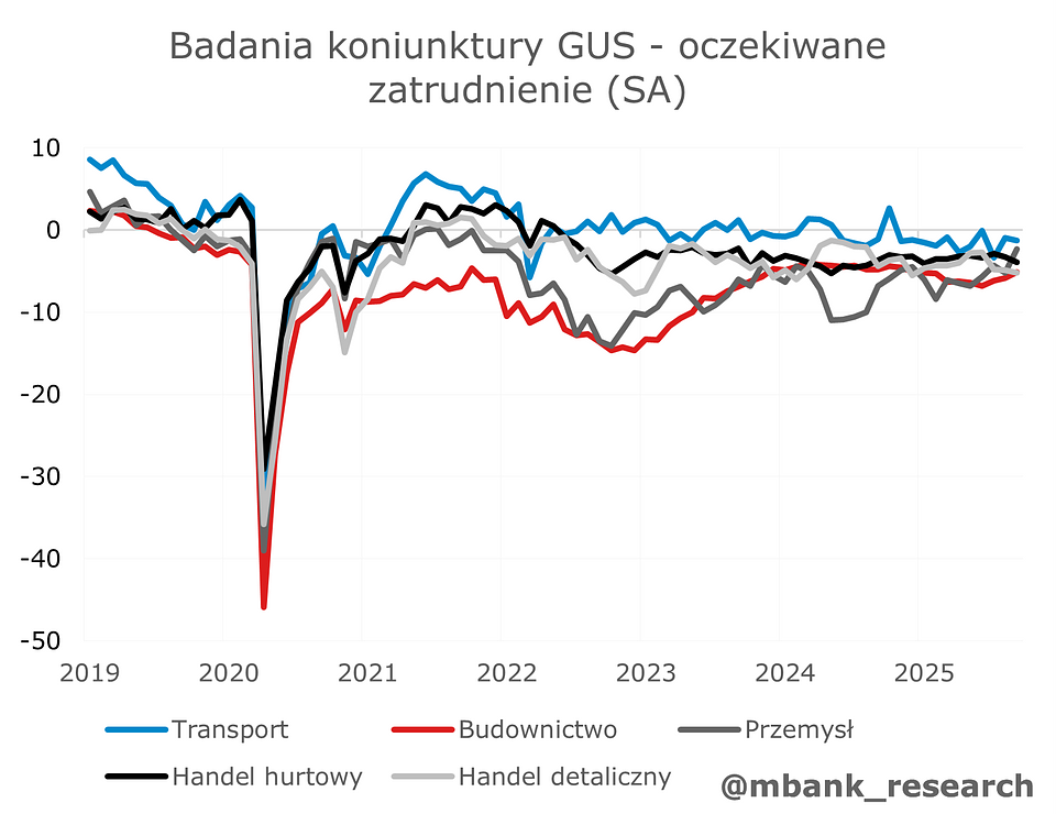 Zatrudnienie (-0,8% r/r --> -0,8% r/r) było stabilne we wrześniu. Komentarz GUS wskazuje, że wśród dużych gałęzi gospodarki najbardziej ciążyły handel (-2,7%), transport (-1,2%) oraz usługi profesjonalne (-0,6%). Badania koniunktury pozostawiają małą przestrzeń na poprawę w tych segmentach w kolejnych miesiącach. Równocześnie wyniki sugerują nieco większy optymizm w budownictwie i przemyśle – to odbicie po słabszych wynikach w 2024 i początku 2025 r. Niemniej to zapewne zbyt mało, aby zobaczyć poprawę do końca roku – liczba ofert pracy przedstawiana w urzędach czy na portalach rekrutacyjnych jest wyraźnie niższa niż rok temu. Dlatego powrót w kierunku pozytywnych poziomów nastąpi raczej w 2026 r. – uważamy, że będzie to jednak wynik przesuwania się osób z małych do większych firm oraz poprawy jakości umów np. przejście ze zleceń na umowę o pracę.