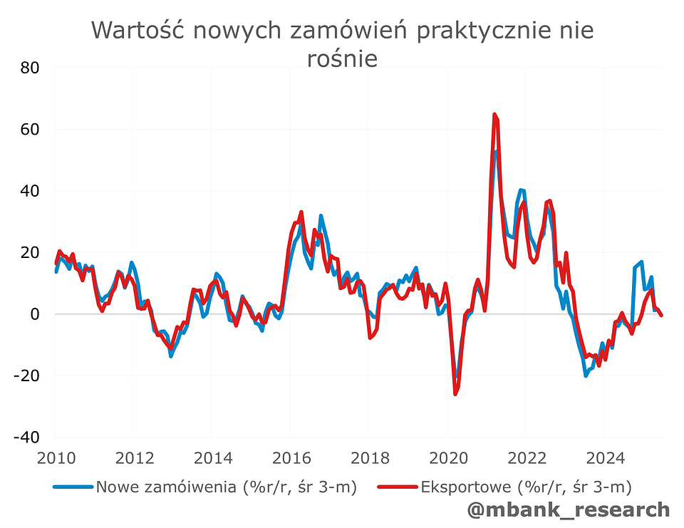 Produkcja przemysłowa (0,7% --> 7,4% r/r) zaskoczyła bardzo solidnym wynikiem. Komentarz GUS wskazuje, że dużą rolę odegrały branże eksportowe np. motoryzacja czy produkcja maszyn. Dalej jednak stosunkowo szeroka grupa sektorów gospodarczych notowała spadki. W takim otoczeniu utrzymanie wysokiego tempa wzrostu będzie trudne. Dane GUS wskazują, że wartość nowych zamówień rośnie w niewielkim tempie (2-3%), a dodatkowo trend jest spadkowy. W sierpniu uśrednione tempo wzrostu z 3 miesięcy spadło poniżej zera, równie słabe były zamówienia eksportowe. Dane o produkcji napływające z głównych państw UE sugerują małą przestrzeń do poprawy w najbliższych miesiącach.