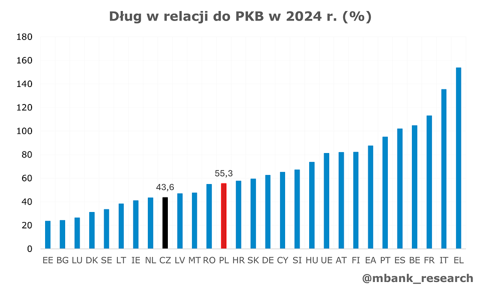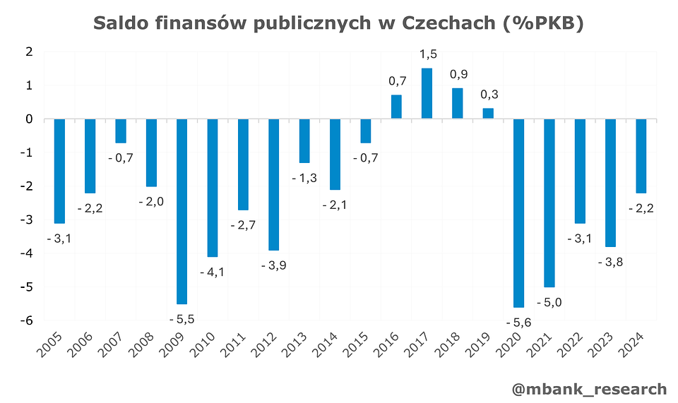 Czeska gospodarka może pozwolić sobie na tak duży impuls fiskalny – rząd P. Fiali zostawił gospodarkę z niskim deficytem – prognozy na 2025 r. wskazują na wynik rzędu 1,9% PKB. Czechy posiadają też jeden z najniższych współczynników długu do PKB w Unii Europejskiej (43,6%). Paradoksalnie taka kondycja uzyskana została dzięki restrykcyjnej polityce oszczędności prowadzonej w ubiegłych latach, która napędziła niezadowolenie społeczne - w trakcie kryzysu energetycznego Czechy wprowadziły stosunkowo ubogie wsparcie gospodarstw domowych. Warto zwrócić uwagę na fakt, że w odróżnieniu od Polski nie doszło np. do obniżenia VAT na żywność w latach największej inflacji (2022-2023). Zmianę kierunku w tym zakresie wywołało dopiero niezadowolenie społeczne – w 2024 stawka spadła z 15 do 12%.
