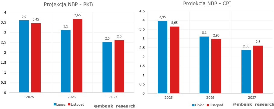 W dalszym ciągu pozostajemy optymistami w zakresie wzrostu PKB. W tym roku będzie on zbliżony do 3,8%, a w przyszłym, na fali wciąż mocnej konsumpcji i znaczącego przyspieszenia inwestycji, wzrost podniesie się do 4,2%. W tym zakresie nic nie zmieniliśmy od września, kiedy to właśnie podnieśliśmy prognozy na 2026 rok. Do tej pory uważaliśmy, że wzrost popytu na pracę w sekcjach pracochłonnych (budownictwo) będzie w stanie zatrzymać dynamiki wynagrodzeń na poziomie około 7%, co jednocześnie zatrzyma postępy w likwidacji inflacji usługowej. W połączeniu z odbiciem dynamik cen towarów trwałych i półtrwałych pozwoli to wprawdzie na osiągnięcie minimów inflacji w okolicach celu inflacyjnego na początku roku, ale później spowoduje jednak odwrócenie się tendencji inflacyjnych w kierunku wzrostów. Nie utraciliśmy wiary w ten mechanizm, ale jego siłę oceniamy obecnie jako niewystarczającą do wyraźnej zmiany trajektorii inflacji.