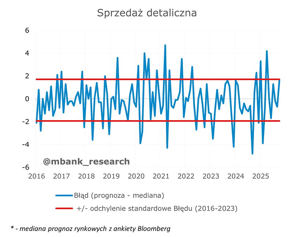 Sprzedaż detaliczna (6.4% --> 5,4%r/r) podobnie jak dwa poprzednie wskaźniki przekroczyła rynkowe prognozy. GUS wskazuje, że dalej w dwucyfrowym tempie rośnie sprzedaż samochodów (15,6%r/r) oraz RTV i AGD (13,9%). Pozostałe kategorie rosną w bardzo umiarkowanym tempie. W naszej ocenie takie dysproporcje na dłuższą metę są nie do utrzymania. Badania koniunktury sugerują spadek raczej spadek skłonności do nowych zakupów w przyszłości, chociaż będzie on dość stopniowy. Mniej osób deklaruje też plan wymiany samochodu i remontu domu niż miało to miejsce w poprzednich kwartałach. Takie plany konsumentów ograniczają szanse na dynamiczny wzrost zakupów dóbr trwałych. Utrzymaniu dwucyfrowych wyników nie pomaga także wolniejsze tempo wzrostu wynagrodzeń. Łącznie konsumpcja będzie już raczej rosnąć w nieco wolniejszym tempie.