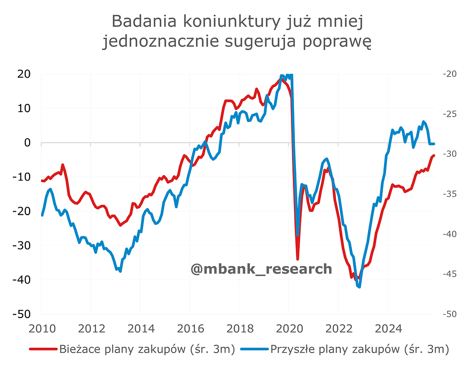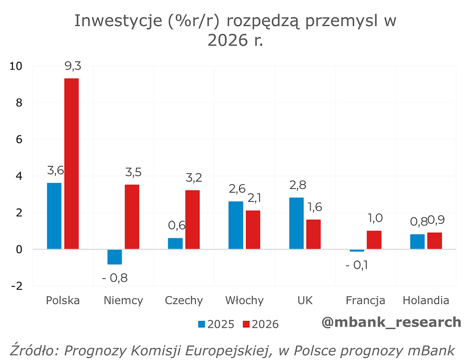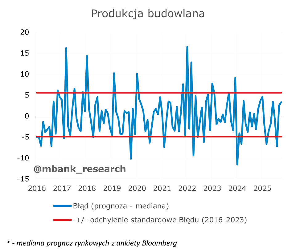 Produkcja przemysłowa (7,6% --> 3,2%r/r) ponownie zaskoczyła pozytywnie, choć same tempo wzrostu jest raczej przeciętnie. Wyniki napędzają głównie producenci dóbr inwestycyjnych (9,2%r/r) – dwucyfrowe wyniki obserwujemy w przypadku produkcji maszyn oraz pozostałego sprzętu transportowego (głównie taboru kolejowego). Taki trend prawdopodobnie utrzyma się przez kolejne kwartały – w Polsce zobaczymy przyśpieszenie wydatkowania środków z KPO i funduszy spójności, a prognozy Komisji Europejskiej czy projekcje ECB wskazują na utrzymanie wysokich nakładów także w strefie euro. Na tym tle nieco słabiej będzie wyglądać aktywność konsumencka – produkcja dóbr trwałych (0,6%r/r w październiku) wciąż jest słabym ogniwem, a kolejne miesiące będą raczej stonowane pod względem popytu zagranicznego. W ten obraz w "jakiś" sposób wpisuje się też wciąż wysoka aktywność podażowa Chin.