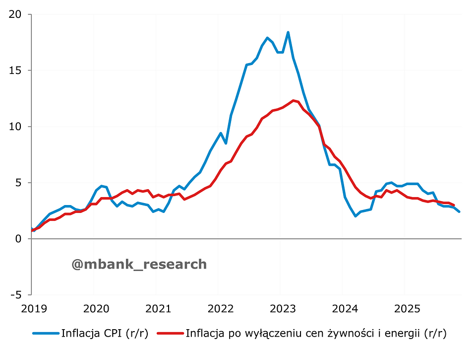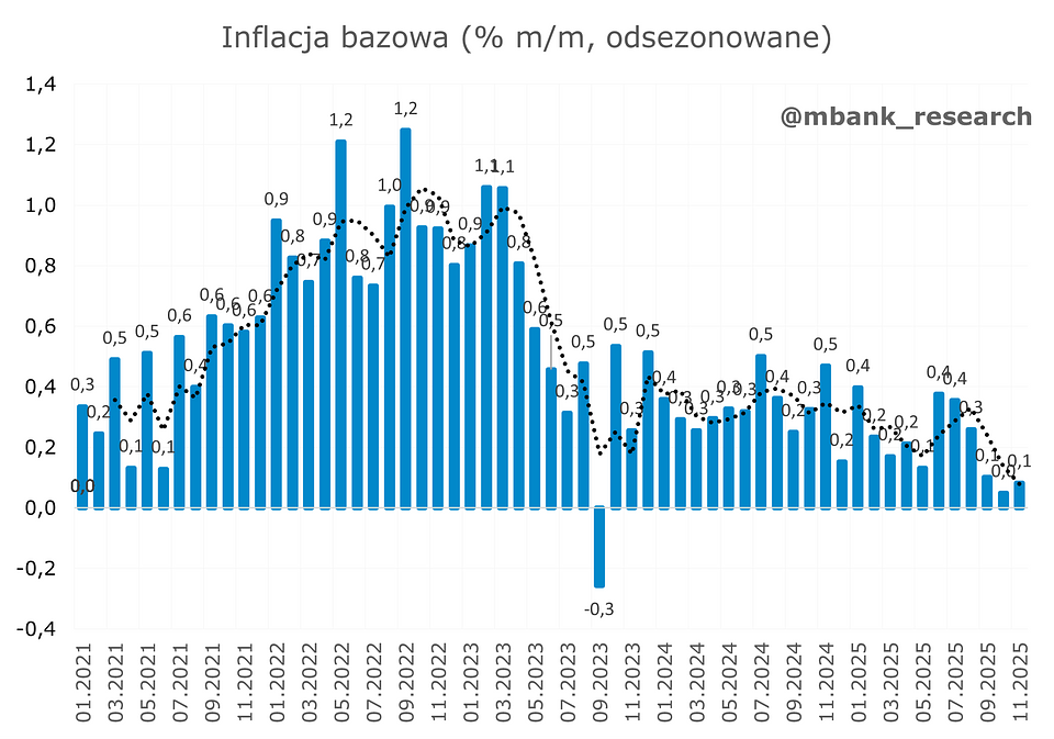 Inflacja (2,8% r/r --> 2,4% r/r) w listopadzie obniżyła się mocniej niż wskazywały na to rynkowe oczekiwania, choć należy brać pod uwagę, iż jest to dopiero wstępny odczyt GUS. Najważniejszą informacją jest źródło zaskoczenia, gdyż według naszych szacunków należy szukać go nie w cenach żywności, energii czy paliw, a inflacji bazowej. Ta w samym listopadzie mogła obniżyć się nawet do 2,6% r/r (w październiku 3% r/r). Jeszcze optymistyczniej na inflacyjny obraz krajowej gospodarki można spojrzeć przez pryzmat rozpędu inflacji bazowej. Jeśli bowiem usuniemy z miesięcznych danych wahania sezonowe wówczas okaże się, iż w porównaniu z październikiem bazowa część koszyka wzrosła o skromne 0,1% (podobne wyniki osiągaliśmy w poprzednich dwóch miesiącach). Innymi słowy, jeśli taką wartość zannualizujemy, wtedy okaże się, że rozpęd inflacji bazowej znajduje się raptem nieco ponad 1%.
