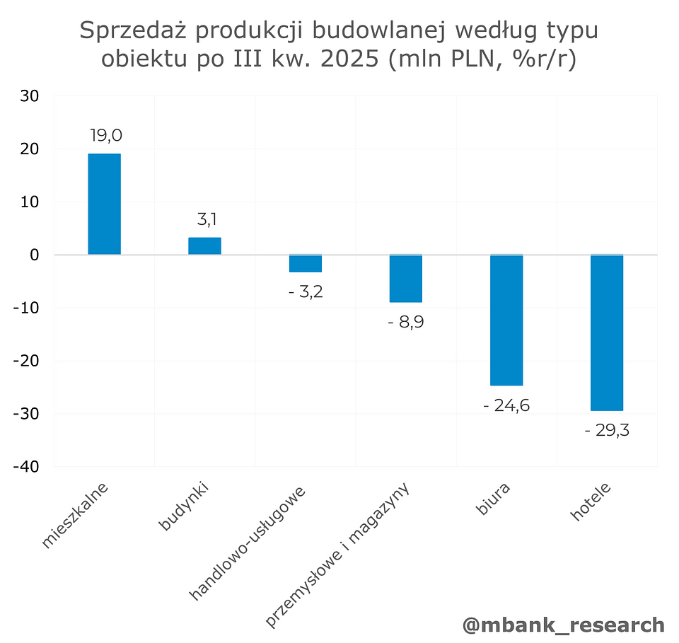 Produkcja budowlano-montażowa (-0,2% --> 4,1% r/r) także sugeruje rozpędzanie się inwestycji. Październik przyniósł silniejszy wzrost głównie za sprawą robót specjalistycznych (7,8%r/r), podczas gdy budownictwo mieszkaniowe oraz komercyjne dalej znajduje się w lekkim letargu. W nadchodzących miesiącach spodziewamy się poprawy na rynku mieszkaniowym – BIK wskazuje, ze wartość zapytań kredytowych jest obecnie o 40% wyższa niż rok temu. Równolegle wciąż ciężko liczyć na poprawę przy wznoszeniu budynków przemysłowych, czy powierzchni magazynowej w związku z mniej dynamicznym rozwojem branży. Także liczba galerii handlowych będzie raczej kurczyć się niż rozszerzać – powinniśmy zobaczyć raczej zmianę nierentownych obiektów na budynki mieszkaniowe. Tu warto zwrócić uwagę, że ewentualne prace modernizacyjne czy przekształceniowe będą po części klasyfikowane jako prace budowlane przy wznoszeniu budynków (przebudowa), oraz po części jako roboty specjalistyczne (np. tynkowanie, montaż instalacji, prace wykończeniowe).