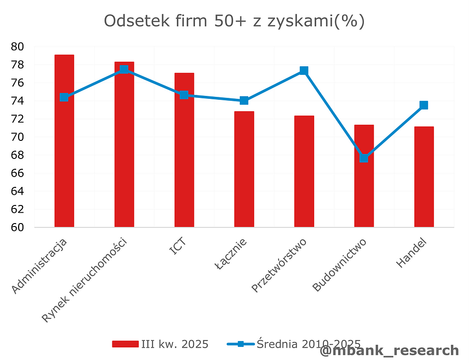 Wynagrodzenia (7,5% --> 6,6% r/r) spowolniły mocniej od prognoz w październiku, jednak był to głównie efekt słabszych wyników w transporcie (2,4%) oraz handlu (5,9%). W pozostałych branżach usługowych tempo wzrostu przekraczało 7% w przetwórstwie 8%. Początek nowego roku przyniesie dalsze hamowanie. Wyniki finansowe średnich i dużych przedsiębiorstw dalej są słabsze od historycznej średniej -osłabienie szczególnie dotyka głównych gałęzi gospodarki (przemysłu, handlu). W takim otoczeniu szanse na szybkie odwrócenie trendu spadkowego są małe, nawet w obliczu przyśpieszającej gospodarki. Rentowność obrotu brutto w przemyśle, handlu, obsłudze rynku nieruchomości oraz informatyce i telekomunikacji jest obecnie niższa od historycznej średniej - firmy działające w tych sektorach mogą w pierwszej kolejności skupiać się na poprawie wyników finansowych. Na tym tle lepiej wygląda sytuacja w innych firmach usługowych - wyniki przekraczają obecnie średnie poziomy.