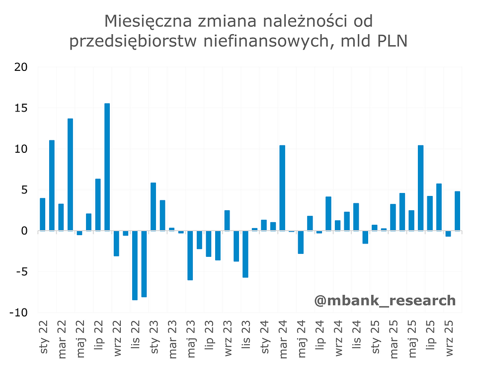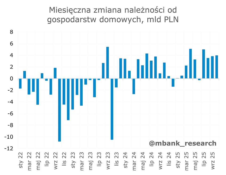Podaż pieniądza M3 (11,1% r/r --> 10,6% r/r) wzrosła ponownie w dwucyfrowym tempie, co spotkało się z konsensusem rynkowym. Od strony czynników kreacji pieniądza warto zwrócić uwagę na kolejny miesiąc ze wzrostem po stronie należności od gospodarstw domowych (kredyty). Jednocześnie, po słabym wrześniu, odbicie nastąpiło również w przypadku należności ze strony przedsiębiorstw niefinansowych. Poza tym o blisko 22 mld zł wzrosło zadłużenie netto sektora centralnego (więcej emisji obligacji netto), co nie jest specjalnym zaskoczeniem. Dekompozycja rocznej dynamiki agregatu M3 wskazuje w ostatnim czasie na malejącą rolę aktywów zagranicznych netto i rosnącą rolę deficytu budżetowego. Pozostałe składowe nie wykazywały większych zmian.