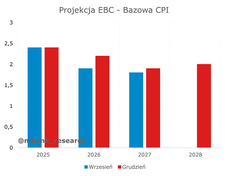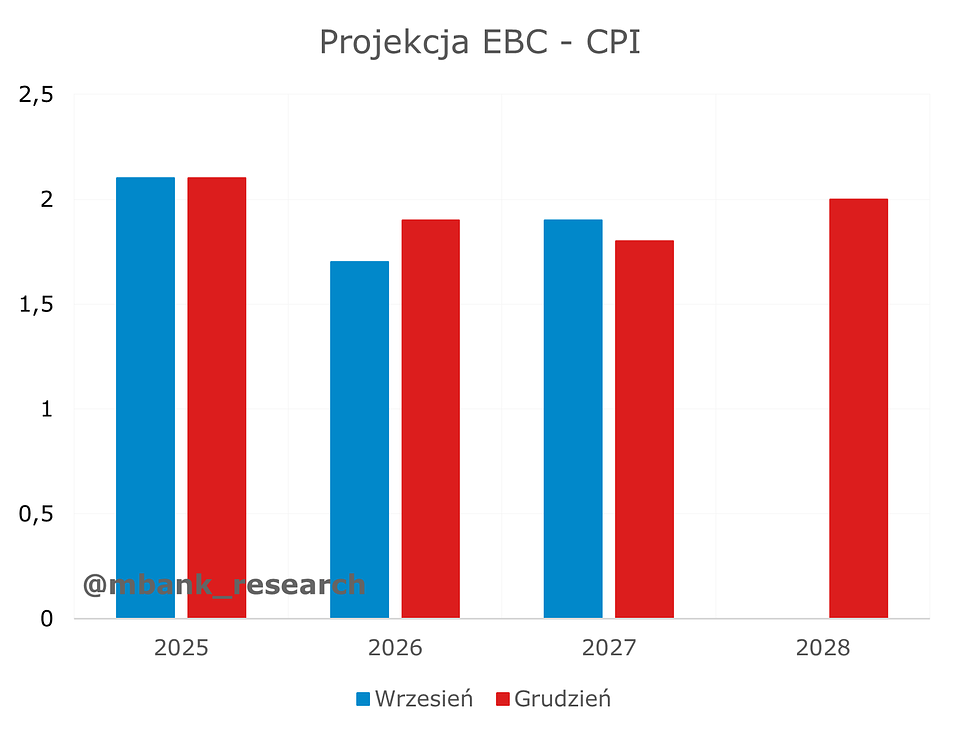 Znacznie ciekawsze okazały się projekcje makroekonomiczne, zarówno te dla inflacji jak i wzrostu PKB. Dla kontekstu przypomnijmy, że kilka tygodni wcześniej na rynku zaczęły krążyć obawy, iż grudniowa projekcja może przedstawić zbyt niską ścieżkę inflacji. Argument ten został podchwycony przez niektórych członków EBC jako potencjalny czynnik za jeszcze niższymi stopami. Rzeczywistość okazała się jednak inna. Świeża projekcja inflacji pokazała rewizję w górę, wskaźnika HICP jak i jego części bazowej. Na obecnym etapie to w zasadzie najważniejsza informacja, gdyż spoglądanie na 2027 i 2028 rok obarczone jest bardzo wysokim ryzykiem. Tak czy inaczej, EBC nie dostrzega ryzyka "niedostrzelenia" celu inflacyjnego w horyzoncie projekcji.