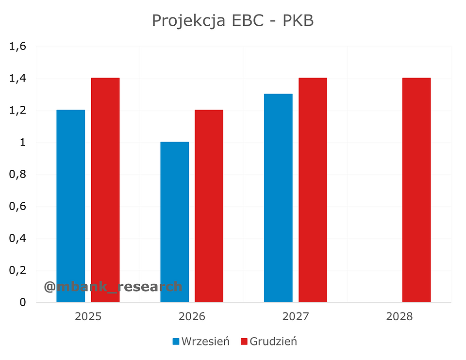 Obraz dopełnia projekcja wzrostu PKB, która na przyszły rok także powędrowała w górę z 1% do 1,2%. W górę zrewidowano również szacunek na 2027 rok z 1,3% do 1,4%. Takie liczby częściowo mogą tłumaczyć nieco większą presję inflacyjną widoczną na powyższych wykresach. Podkreślono, że EBC bazuje na solidnym popycie krajowym oraz antycypowanemu obniżeniu stopy oszczędności. Jednocześnie duże nadzieje pokładane są wciąż w wydatki rządowe na obronność. Taka ścieżka PKB zamyka jednak drogę do niższych stóp, zwłaszcza jeśli grudniowa projekcja miałaby się zmaterializować.