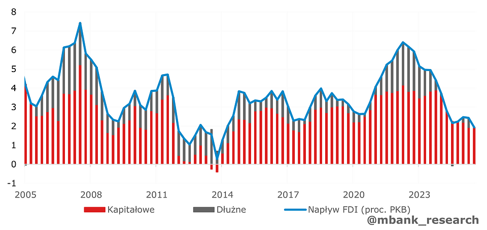 * Kilka dni temu opublikowaliśmy już tekst o FDI (link). Nacisk położony był w nim jednak bardziej na opisową stronę mechanizmów przepływu, ze szczególnym uwzględnieniem dotychczasowej struktury w 3 wymiarach: geograficznym, kompozycyjnym i branżowym. Być może część czytelników może czuć się zawiedziona, że nie odpowiedzieliśmy na niezadane pytanie: „Dlaczego zaobserwowaliśmy w 2024 roku tak duży spadek napływu?”. Ten tekst domyka tę lukę.