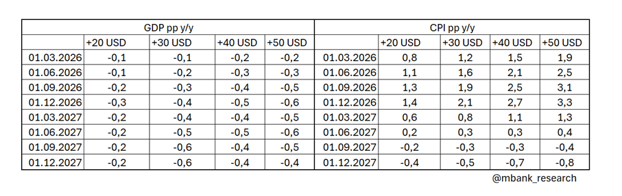 Notowania waluty są stabilne, giełda otworzyła się niewielkimi spadkami. To jest konflikt, który ma na Polskę przełożenie głównie przez ceny ropy naftowej oraz inne zakłócenia łańcuchów dostaw. Najciekawszy jest wpływ na RPP, co opisujemy w osobnym pytaniu. Poniżej dokonaliśmy przeliczeń wg modelu Oxford Economics dla różnych scenariuszy wzrostu ropy naftowej (rozważamy trwałe podniesienie się poziomu cen ropy w różnej skali). Uwaga: wpływ na inflację wydaje się znacząco zawyżony względem innych modeli, w tym modeli NBP.