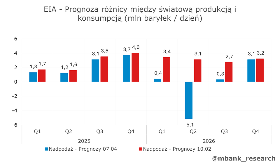 Mając na uwadze wspomniany układ, chcemy przeanalizować wpływ szoku energetycznego na bilanse handlowe państw UE. Punktem wyjściowym dla naszej analizy będą kwietniowe prognozy agencji ds. informacji o rynku energii (EIA). Scenariusz zakłada utrzymanie się ceny baryłki ropy Brent w okolicy 100 USD do końca II kwartału 2026. Takie oczekiwania są mniej więcej zbieżne z obecną ścieżką kontraktów terminowych. Warto chwilę poświęcić jednak rynkowemu uzasadnieniu prognoz. Szacunki wskazują, że przerwa w dostawach utrzyma się do początku III kwartału – zobaczymy duży deficyt podaży w II kwartale oraz wciąż istotną wyrwę także kwartał później.