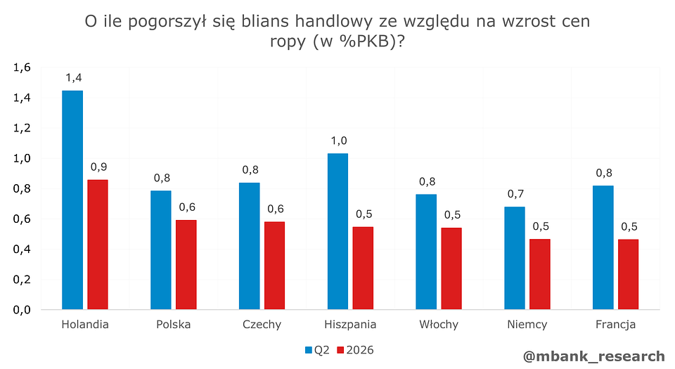 Szacunki wskazują, ze zdecydowana większość państw UE obecnie mierzyć się będzie z dodatkowym wzrostem importu o wartości zbliżonej do 0,5% PKB – wśród głównych gospodarek wyjątkiem jest Holandia, gdzie impuls jest prawie dwukrotnie silniejszy z uwagi na spory udział przemysłu rafineryjnego. Według modelu, część państw np. Hiszpania i Francja będzie nieco szybciej reagować na zmiany cen - dlatego silniejsze wyniki widoczne mogą być już w danych za II kwartał.