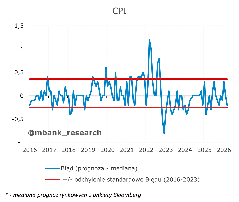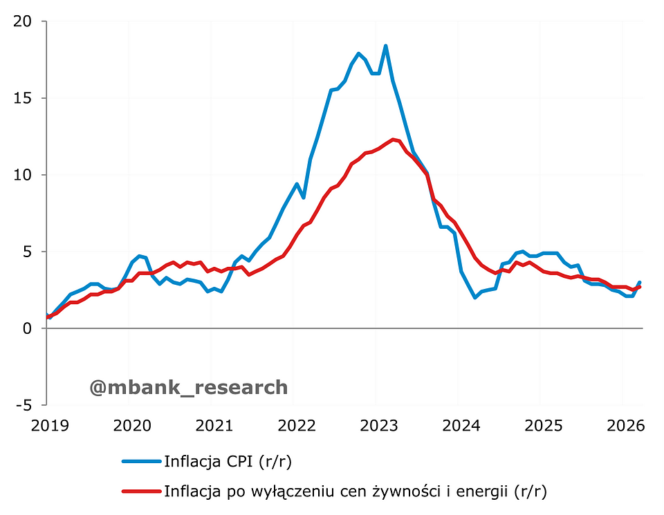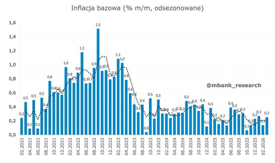 Inflacja (2,1% r/r --> 3% r/r) musiała przyspieszyć w marcu i tak też się stało. Głównym winowajcą są oczywiście ceny paliw, które mocno wzrosły w wyniku wybuchu wojny na Bliskim Wschodzie. Przypomnijmy, że w okresie zbierania danych przez GUS nie obowiązywał jeszcze program odgórnie sterowanych cen paliw na stacjach benzynowych CPN. Warto jednak nadmienić, że ponad 15%-owy miesięczny wzrost cen paliw, choć bardzo wysoki, okazał się względnie niski na tle oczekiwań. Z danych zbieranych ze stacji paliw można była śmiało oczekiwać wyniku przekraczającego 20% m/m. W efekcie inflacja tylko dobiła, a nie przebiła poziom 3%. Bez zaskoczenia obyło się w przypadku cen żywności i energii. Inflacja bazowa z kolei lekko wzrosła do 2,7% z 2,5% w ujęciu rocznym, a główną tego przyczyną był wzrost cen w kategorii zagranicznej turystyki zorganizowanej.