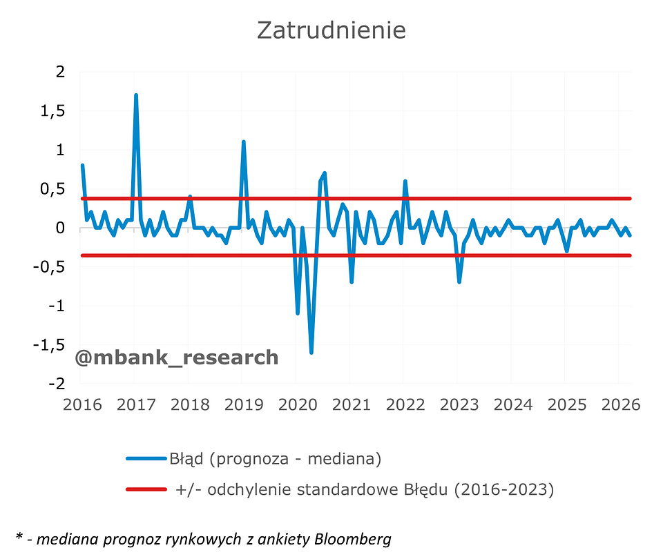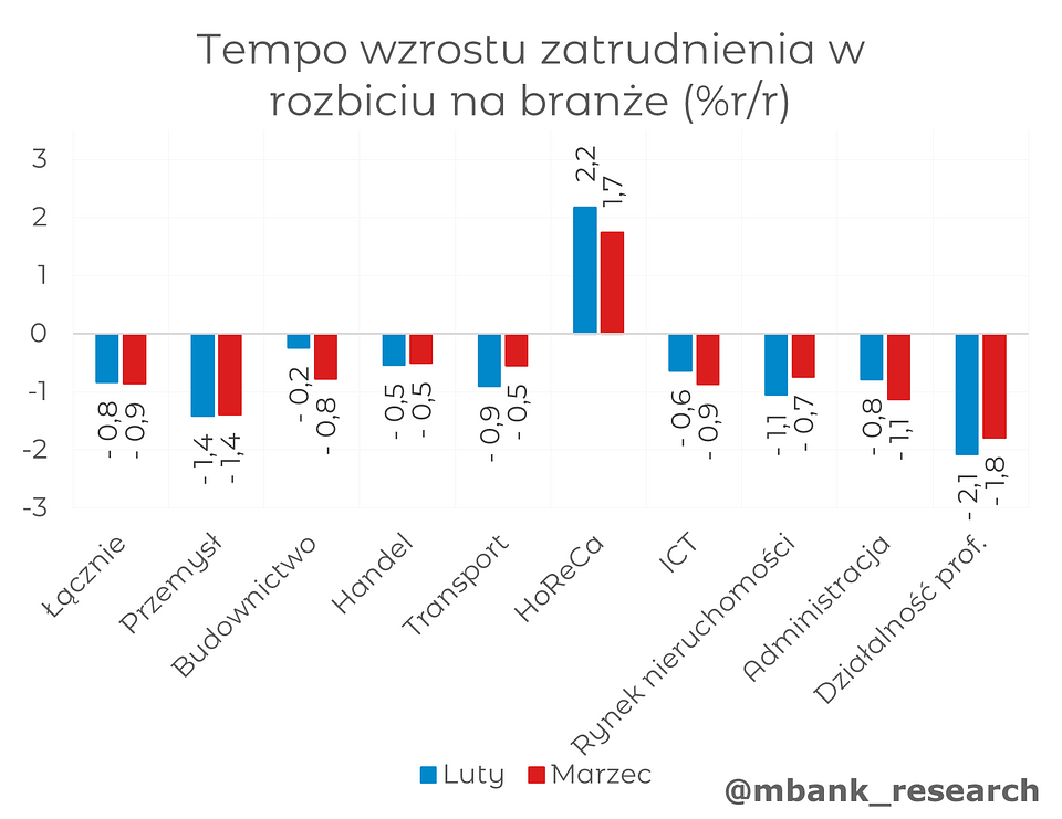 Zatrudnienie (-0,8% --> -0,9% r/r) spadło w marcu, wbrew rynkowym prognozom. Różnice widoczne są jednak głównie na poziomie zaokrągleń. Dane GUS wskazują, że kluczową przyczyną spadku dynamiki rocznej było mniejsze zatrudnienie w budownictwie (z -0,2 do -0,8% r/r) i wolniejszy wzrost w sektorze HoReCa (spowolnienie z 2,2 do 1,7% r/r), zmiany w pozostałych sektorach były raczej umiarkowane - przemysł i handel utrzymywały stabilne dynamiki na poziomie kolejno -1,4% oraz -0,5% r/r.