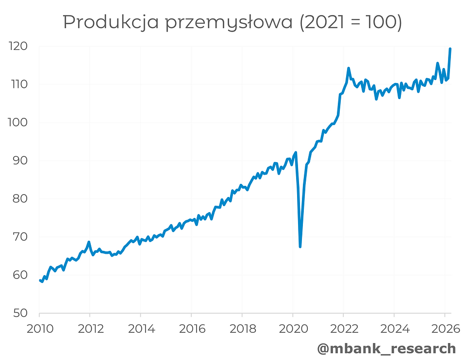 Produkcja przemysłowa (1,5% --> 9,4%r/r) zaskoczyła najsilniejszym wzrostem od czasu zniesienia obostrzeń związanych z Covid-19. Było to efektem kilku czynników: sprzyjała różnica liczby dni roboczych (szacujemy ten efekt na 2 pkt proc. do dynamiki rocznej), odbicie aktywności w sektorach powiązanych z budownictwem oraz wzmożona produkcja żywności i napojów przed świętami. Część tych efektów była jednak w dużej mierze oczekiwana.