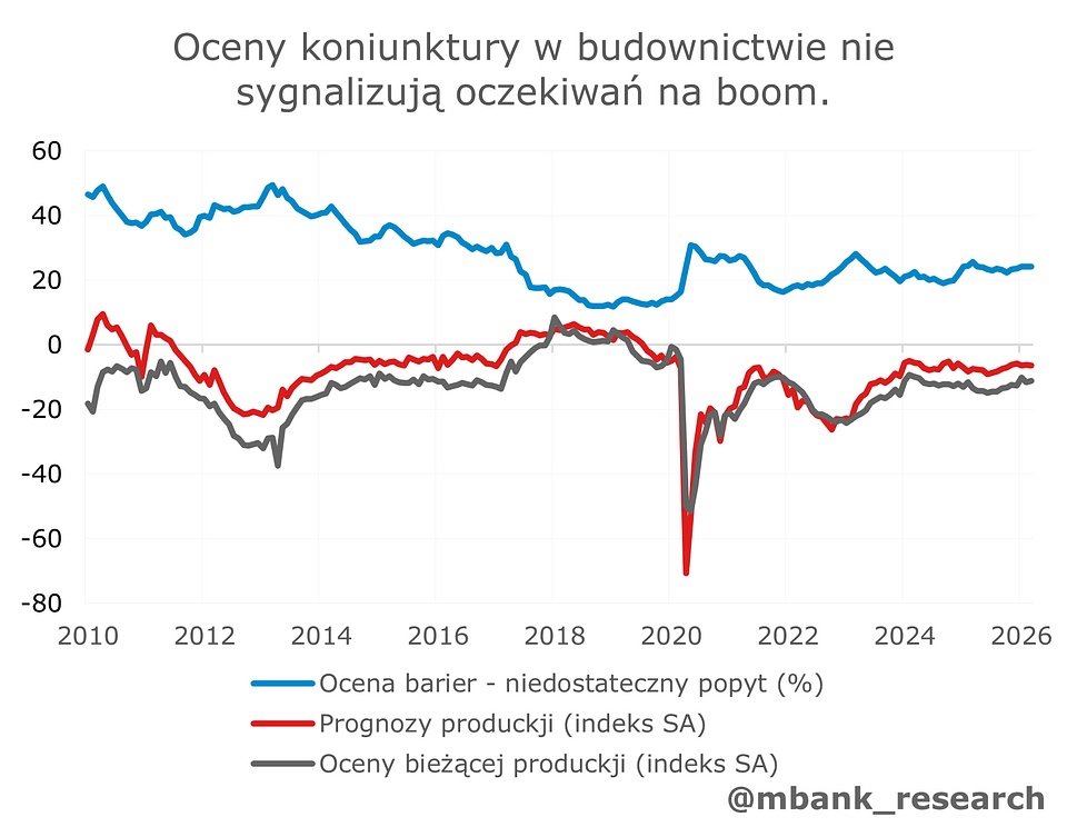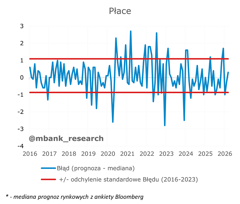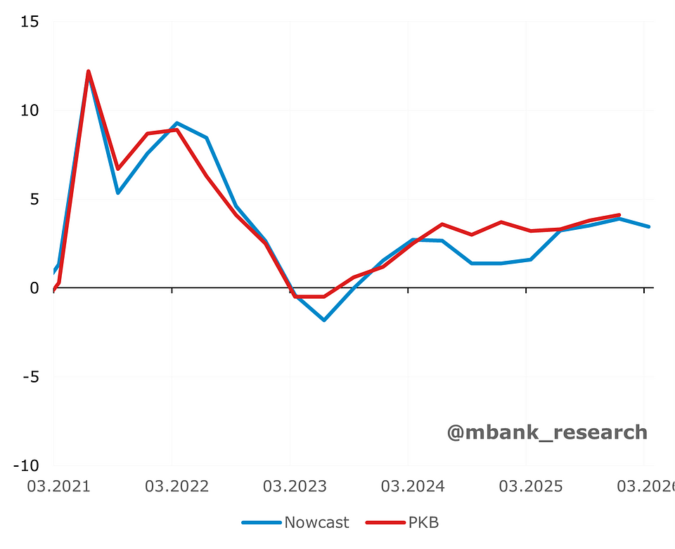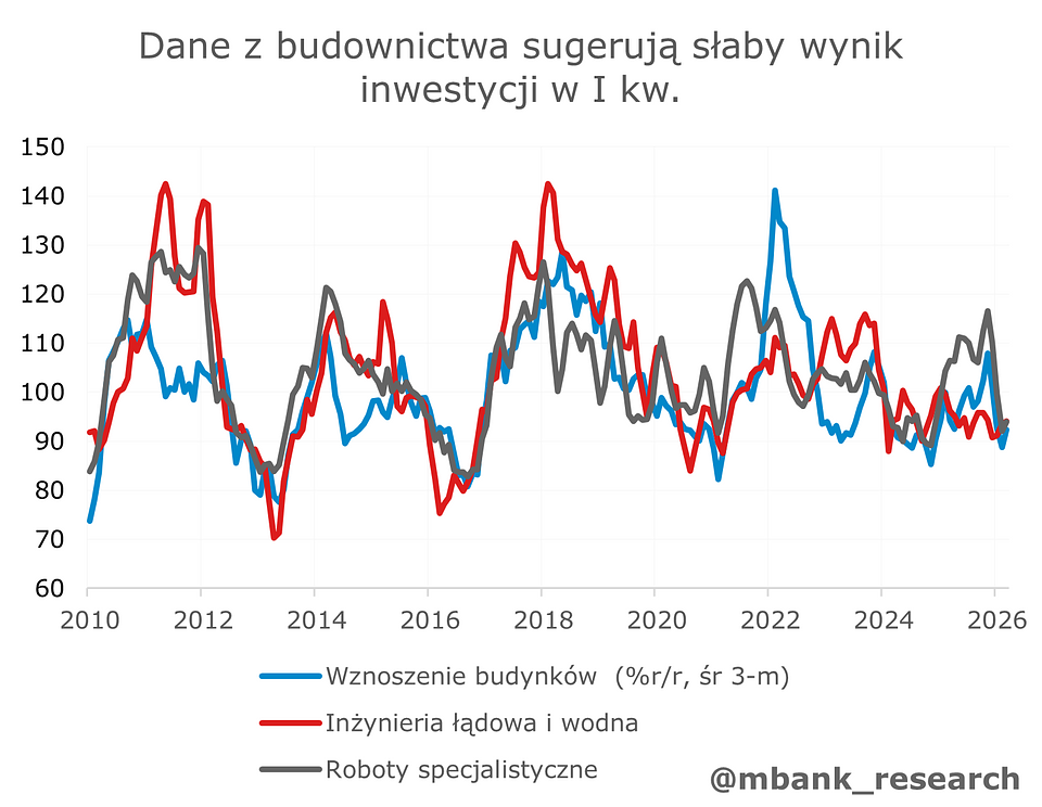 Pierwszy kwartał przyniósł nam istny rollercoaster jeśli chodzi o publikacje miesięcznych odczytów. Dane ze stycznia i lutego sugerowały głębokie spowolnienie wzrostu PKB. Marzec namieszał jednak dość istotnie. Nasza prognoza wzrostu PKB w I kw. (3,4% r/r) jest dziś konserwatywna. Jednocześnie jesteśmy świadomi, iż w marcu mogliśmy ujrzeć sporo czynników jednorazowych, stąd nasze postrzeganie dla całego roku nie ulega zmianie - wzrost PKB w 2026 wyniesie 3,7%.