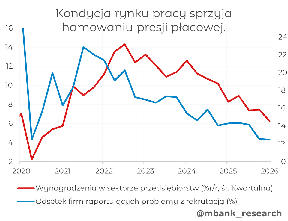 Trudno zatem mówić o powrocie silnej presji płacowej. W dłuższym horyzoncie trend - w naszej ocenie - pozostaje spadkowy. Dane ankietowe wskazują, że firmy coraz rzadziej sygnalizują problemy z rekrutacją, a odsetek przedsiębiorstw planujących podwyżki wynagrodzeń również maleje. Umiarkowany popyt na pracę potwierdzają także główne wskaźniki zatrudnienia.