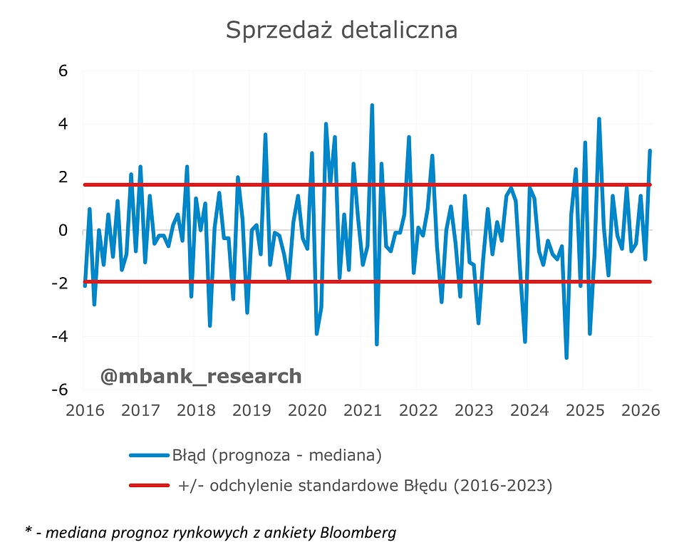 Sprzedaż detaliczna wskazuje, że trend konsumpcyjny pozostaje bardzo silny, mimo spowolnienia dynamiki wzrostu wynagrodzeń. W całym I kwartale dynamika konsumpcji powinna utrzymać się w okolicach 4% r/r.