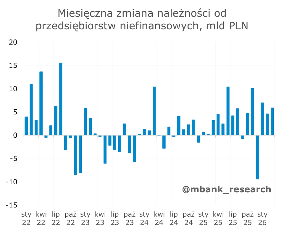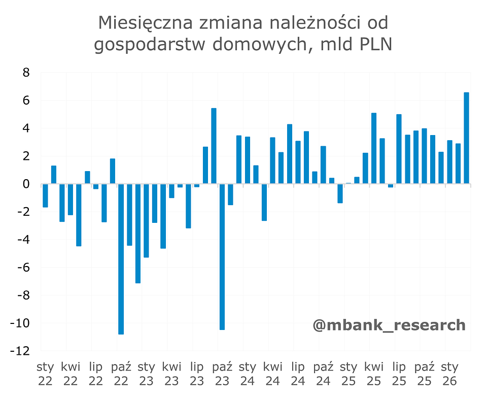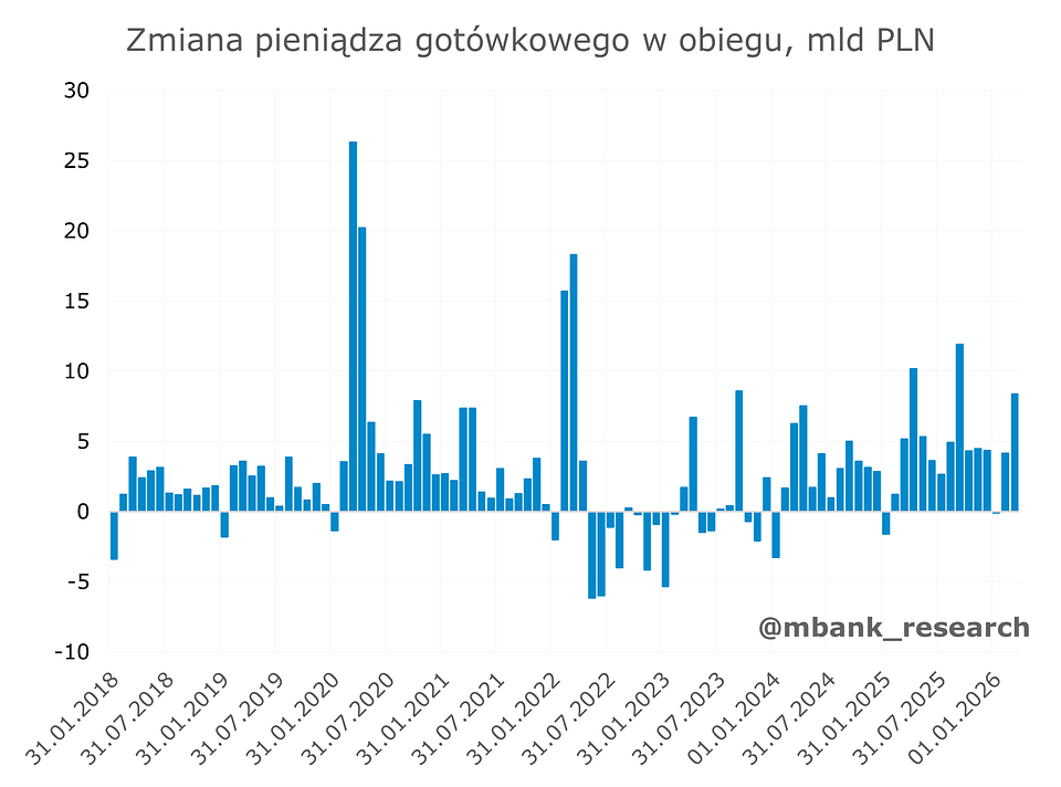 Wreszcie, w marcu zauważalnie wzrosła gotówka w obiegu o ponad 8 mld zł. To prawdopodobnie efekt wybuchu wojny na Bliskim Wschodzie, co zwiększyło niepokój społeczeństwa, a przez to popyt na gotówkę. Podobny schemat obserwowaliśmy w okresie pandemii oraz wybuchu wojny w Ukrainie, choć na nieporównywalnie większą skalę.