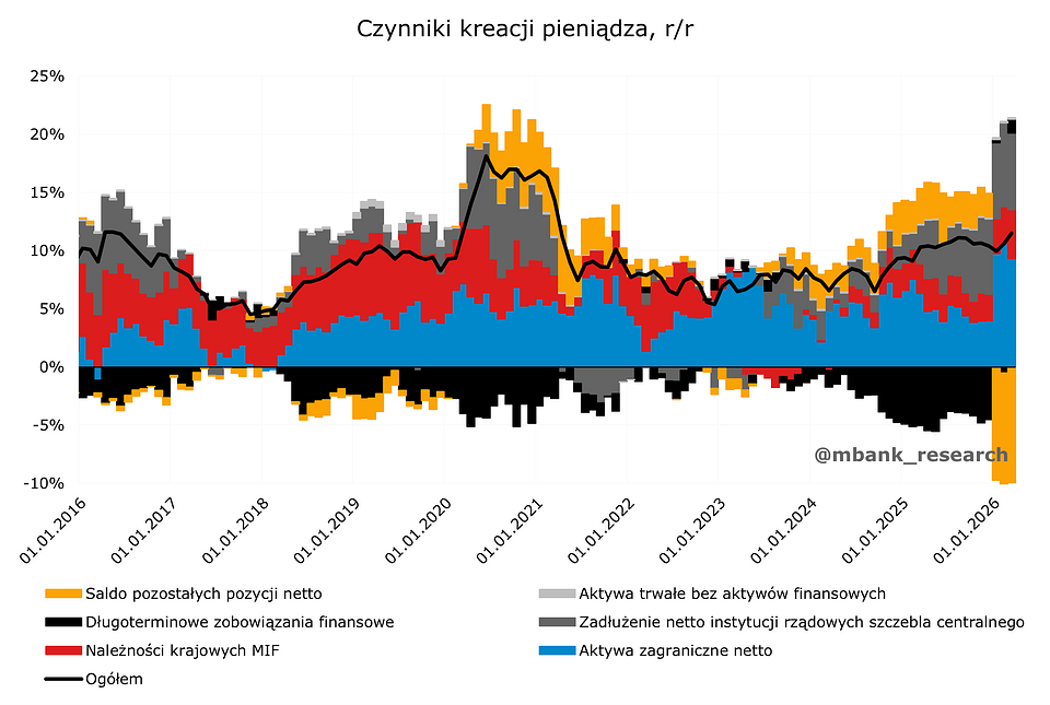 W marcu warto zwrócić uwagę na znaczny przyrost kredytów zarówno do gospodarstw domowych (prawdopodobnie łapanie ofert kredytów hipotecznych ze stałą stopą przed wzrostem oprocentowania) jak i przedsiębiorstw niefinansowych. Niemiej wzrósł również wolumen kredytów do firm finansowych (nie banków). Wszystko to może sygnalizować budzenie się popytu inwestycyjnego. To również czynnik, który podbił roczną dynamikę całego agregatu w marcu. W tym wszystkim trzeba wziąć pod uwagę również osłabienie złotego, jakie miało miejsce na przestrzeni ubiegłego miesiąca. Bez niespodzianek obyło się z kolei w przypadku wpływu polityki fiskalnej na podaż pieniądza - tutaj cały czas widoczny jest przyrost zadłużenia netto państwa, naturalnie w przytłaczającej większości z tytułu obligacji skarbowych.