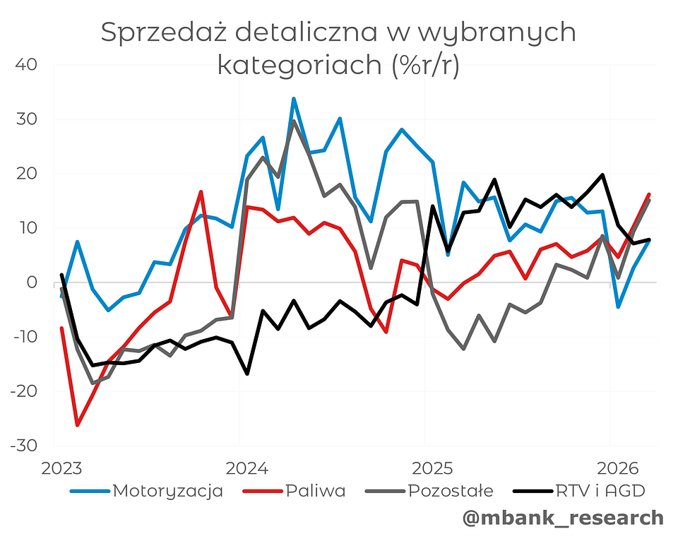 Sprzedaż detaliczna (5,3% --> 8,7% r/r) również przekroczyła oczekiwania, choć skala zaskoczenia była nieco mniejsza niż w przypadku produkcji przemysłowej. Dane zostały częściowo podbite przez wzrost sprzedaży paliw (16,2% r/r), związany z obawami przed podwyżkami cen. Jednocześnie wyraźnie dobre wyniki odnotowano w kategoriach związanych z dobrami trwałymi, takich jak sprzedaż samochodów (7,7% r/r), sprzętu RTV i AGD (7,9% r/r) oraz w kategorii „pozostałe” (15,1% r/r).